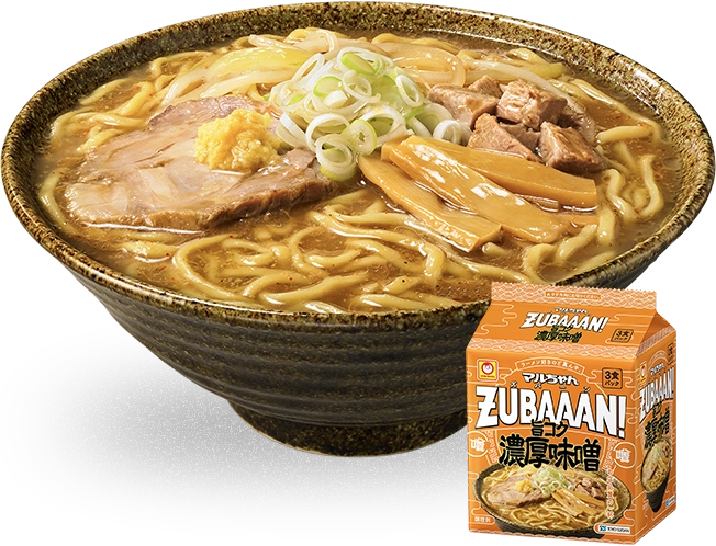 ちぢれを利かせたコシの強いノンフライ麺。 - 味噌・ポーク・チキンの旨味をベースに、